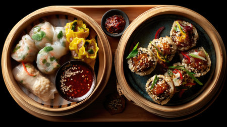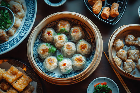 An overhead shot presents an array of Asian cuisine. Steaming dim sum, dumplings, and various side dishes in small bowls are visible. The composition displays vibrant colors, textures, and selective focus with a dark background. This image is suitable for food blogs, restaurant menus, or culinary publications.