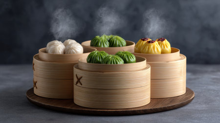 A captivating arrangement of freshly steamed dim sum dumplings presented in bamboo baskets, showcasing vibrant colors and steam rising in a moody setting.