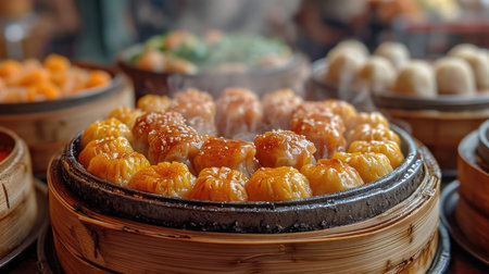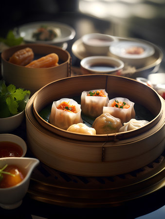 Dim Sum Assortment Unwind: Steaming Bamboo Basket of Assorted Dim Sum in Traditional Chinese Restaurant, Lively Atmosphere