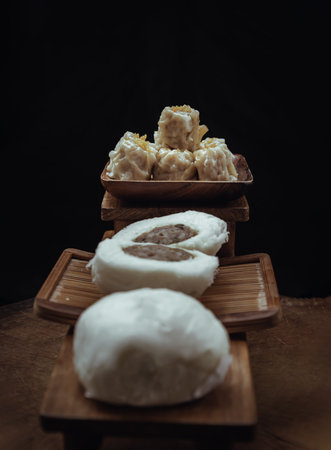 A serving of warm steamed buns and savory siu mai arranged on a rustic wooden table, highlighting their delicious fillings and golden-brown tops.