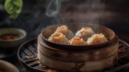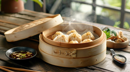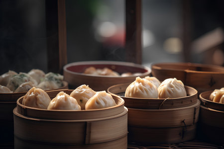 homemade dumplings in bamboo steamer, created with generative ai