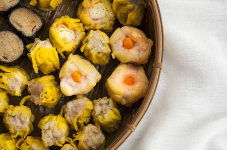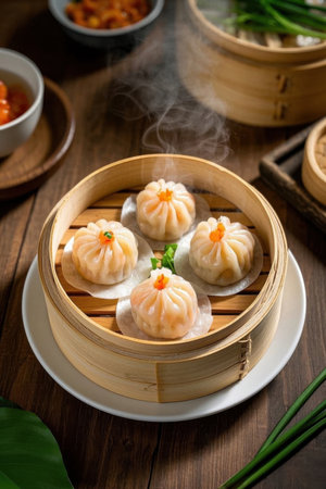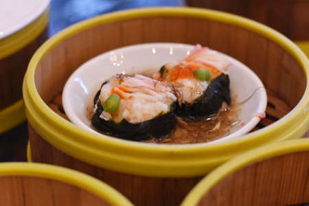 Fresh dim sum in bamboo bowl, Chinese cuisine