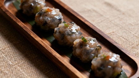 Fresh prepared asian steamed selection of dimsum dumplings on local market in Bangkok. Traditional thai cuisine made of fresh ingredients.