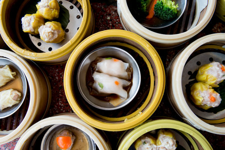 yumcha, dim sum in bamboo steamer, chinese cuisine