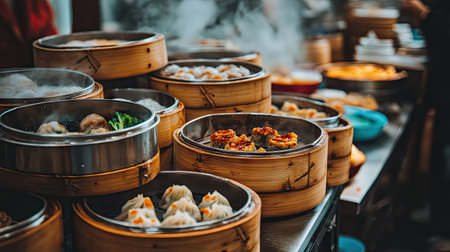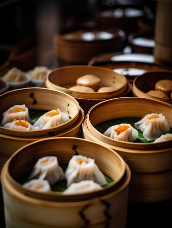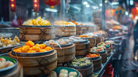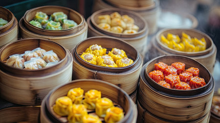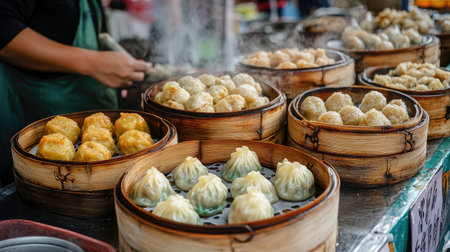 Explore a colorful display of freshly steamed dumplings in bamboo baskets at a vibrant street food market, showcasing culinary traditions and delicious flavors.