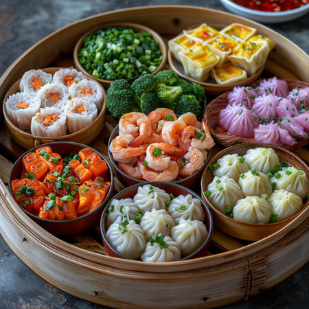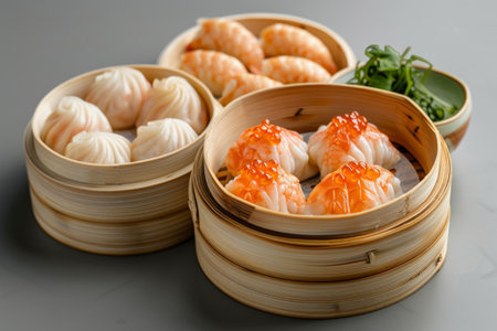 Generative AI Image of Variant Chinese Authentic Cuisine Dim Sum Dumpling Set on Bamboo Steamer