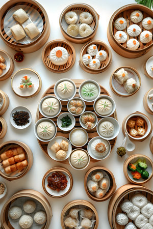Various dim sum displayed on white table, artfully arranged in a circle