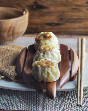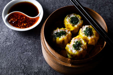 Steamed buns with minced pork filling and Pork shumai or Chinese steamed dumpling served with sour sauce and wooden chopstick. Chinese Dim Sum. Space for text, Selective Focus.