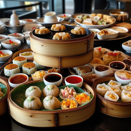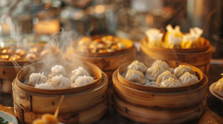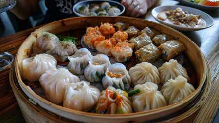 A Delicious dim sum display with various dumplings and buns