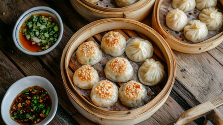 An overhead shot showcases diverse dim sum varieties inside traditional bamboo steamers. The food items feature vibrant orange and white colors, arranged against warm wooden textures. The composition uses natural lighting, suggesting an inviting setting, suitable for culinary advertising or editorial purposes.