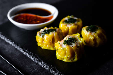 Top view and close up: Dim sum with sour sauce in Chinese food style.