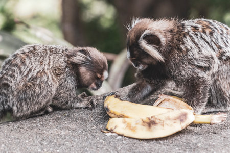 Marmoset monkeys are eating bananas in a green tropical jungle rainforest in Rio de Janeiro State of Rio de Janeiro, Brazil.