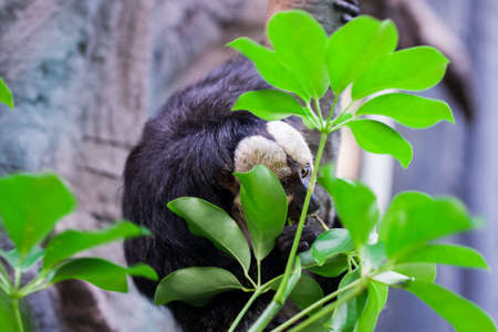 Monkey white-faced capuchin or titi de cara blanca sitting on wood in zoo