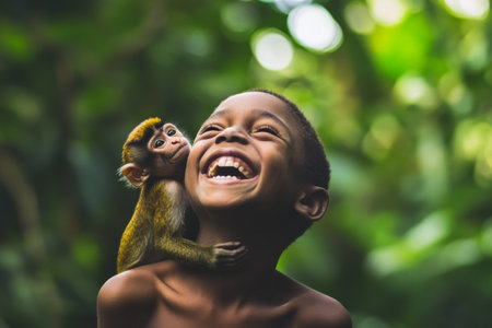 african boy traveler bonding with a curious monkey in lush jungle. a monkey sitting on a boy's shoulders