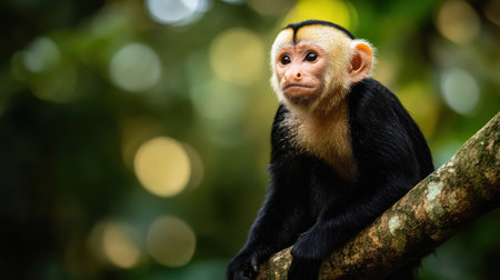A white-faced capuchin monkey is perched on a branch, looking serenely into the distance amidst a vibrant, leafy green backdrop. The daytime setting enhances the colors of the forest