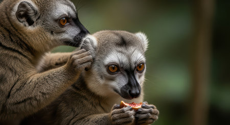 Two lemurs interacting with curious expressions and eating fruit in natural habitat
