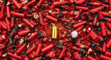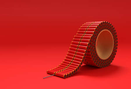 A row of red and gold firecrackers exploding, symbolizing the chinese new year celebration in china, traditional festive atmosphere