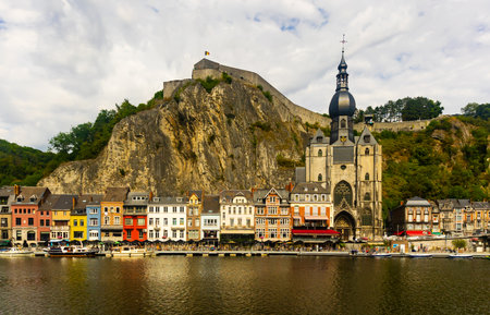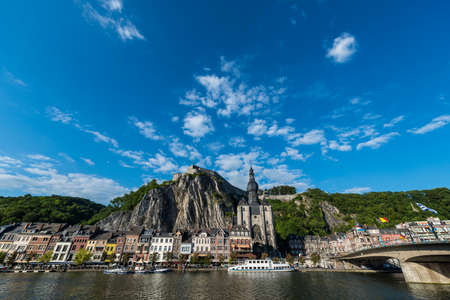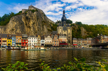 Panoramic view from the embankment of Dinant, Belgium. Cityscape. Travel destinations, national landmarks, sightseeing, tourism, traditional architecture, history, culture, religion