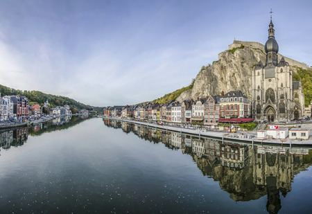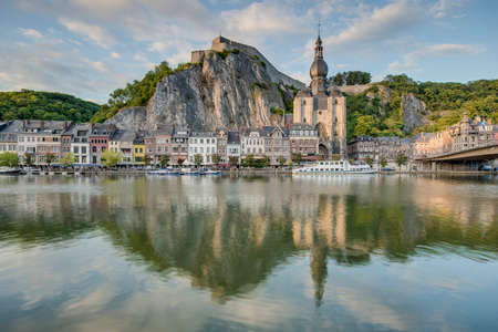 Dinant, Belgium. Cityscape image of beautiful historical city of Dinant with the reflection of the city in the Meuse River at summer sunset.