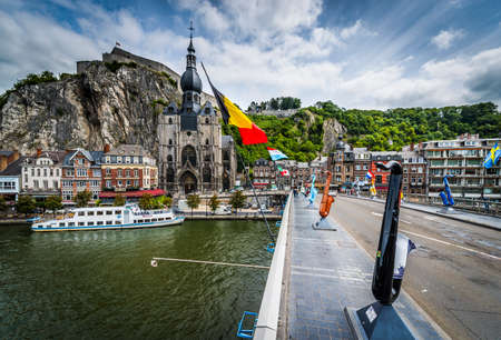 Beautiful city Dinant with church and bridge and famous for sax, Belgium.