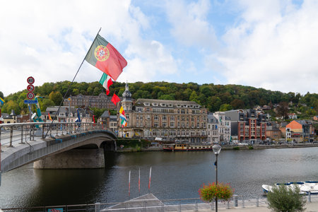 Dinant, Belgium - June 26, 2019: Charles de Gaule bridge spans Meuse River under blue sky. Left bank buildings with historic towered corner building. flags and green foliage.
