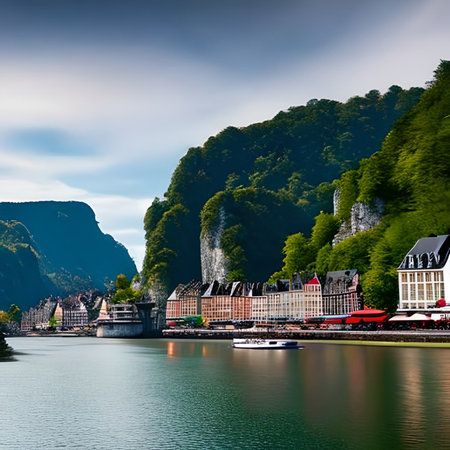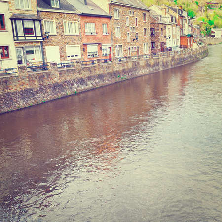 Landscape of Meuse River in Waterfront of Dinant, Belgium in Cloudy Day Outdoors. Retro Styled