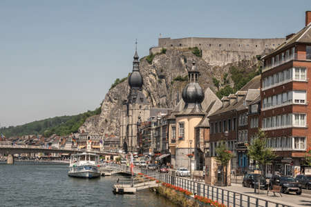Dinant, Belgium - June 26, 2019: Citadelle fortification seen from right north bank of Meuse River with church and buildings, cars, boats under blue sky. Green foliage.