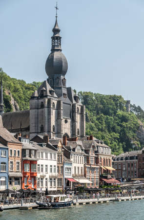 Dinant, Belgium - June 26, 2019: Notre Dame church on River Meuse north right bank at Charles De Gaule bridge behind businesses and restaurants under blue sky. Green foliage.