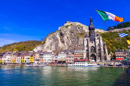 View at the embankment of Meuse river with multicolored houses and church of Our Lady Assumption in Dinant - Belgium