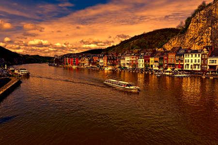 Embankment of the River Meuse in the Belgian City of Dinant at sunset. Beautiful small town Dinant in Belgium.