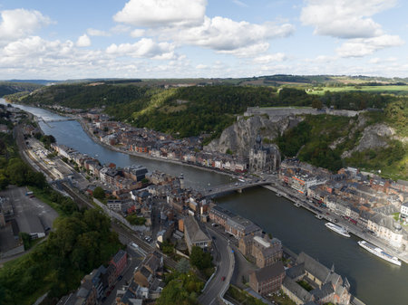 Aerial overview of the village of Dinant in Belgium, citadel and river.