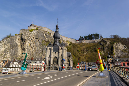 DINANT, BELGIUM - MARCH 25 2018: Charles de Gaulle bridge with saxophone statues and background of Citadel of Dinant on March 25,2018 in Dinant, Belgium