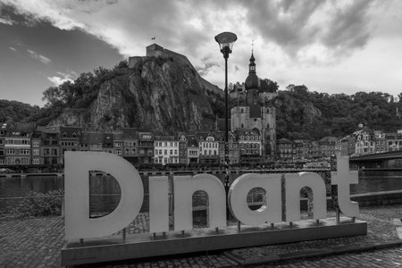 Embankment of the River Meuse in the Belgian City of Dinant. The Meuse River passing through the town of Dinant, located in the Walloon. Black and White Picture
