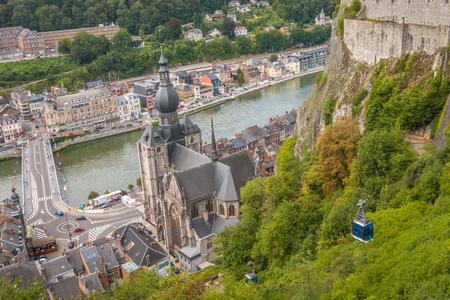 Aerial view of Dinant on Meuse river with Collegiate Church and fortified castle, Belgium