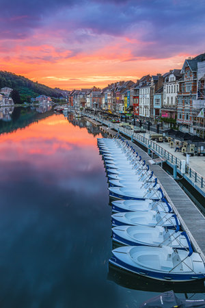 Colorful sunset in Belgium of the city of Dinant. River Maas with old riverside houses. Reflection of houses and sunset on the water surface. Many rowing boats attached to the jett