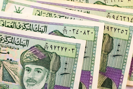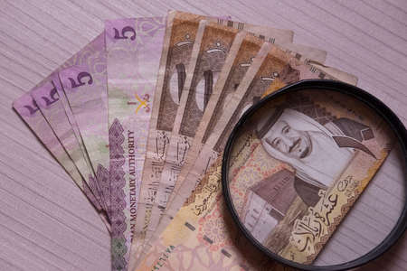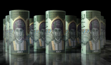Oman Rial money rooled 3d illustration. OMR banknote roll. Concept of finance, cash, economy crisis, business success, recession, bank, tax and debt.