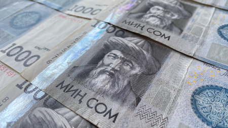 1000 SOM banknotes with a portrait of the writer Yusuf Balasaguni, the current money of Kyrgyzstan. Background of the Kyrgyz national currency. cash banknotes. Financial business background concept.