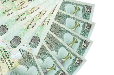 10 UAE dirhams bills lies isolated on white background with copy space stacked in fan shape close up. Financial transactions concept