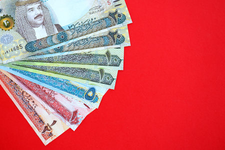 Bahraini dinar money bills in big amount on red close up. Finance and banking concept