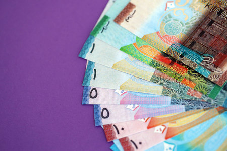 Kuwaiti dinar money bills in big amount on purple close up. Finance and banking concept