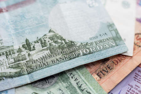 Bahraini dinar currency money bills. The current banknotes lies on table in big amount close up