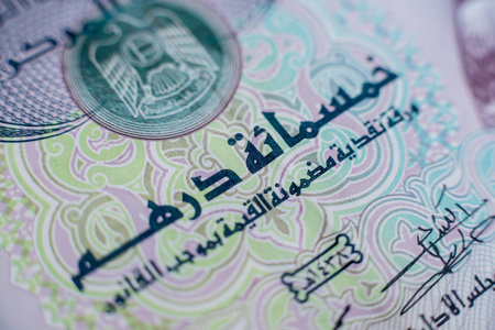 Closeup of UAE 500 dirhams currency notes amongst othet notes, paper money