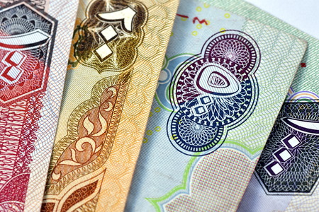 A close up view of United Arab Emirates currency, with white background, UAE Dirhams