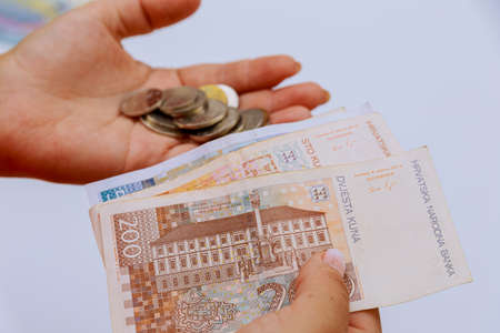 Croatian kuna and coins lipa in the hands of a woman on a white background.