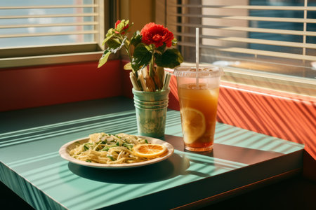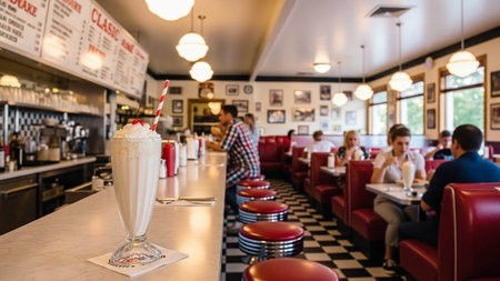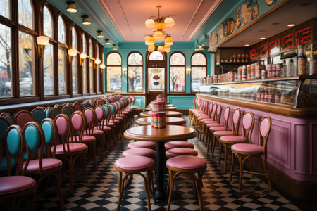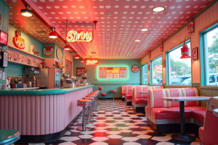 retro-themed fast food restaurant with vintage decorations, chic furnishings and 1950s music playing in the background, created with generative ai