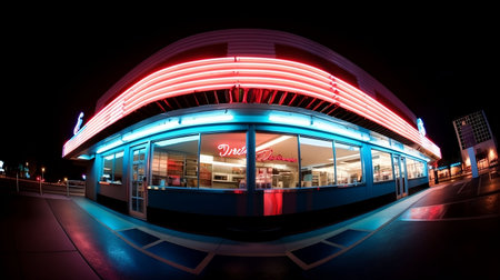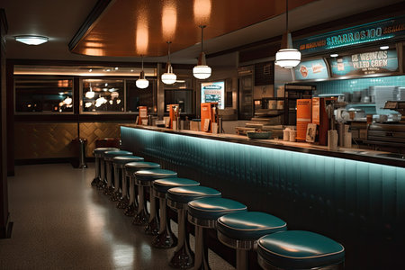 fast food restaurant with dimly lit interiors and retro design, bringing back the nostalgia of classic 1950s diners, created with generative ai
