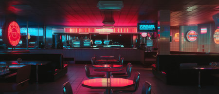 Retro neon-lit diner interior with vintage decor and empty booths