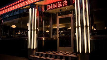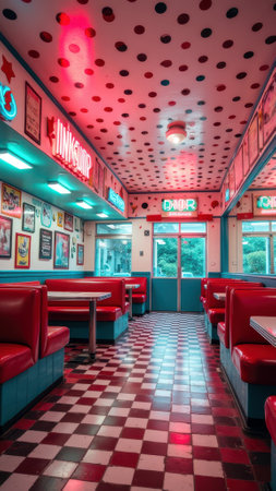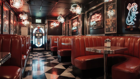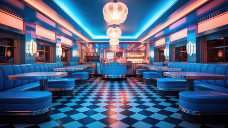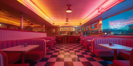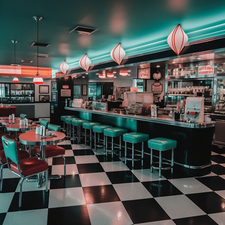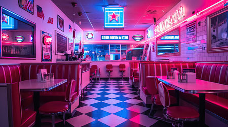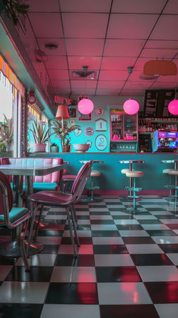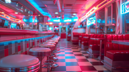 Vibrant American retro diner with neon lighting and classic checkered floor