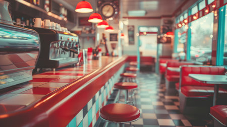 An image of a classic American diner showcasing its checkered floor and red stools, An old-fashioned diner serving burgers and milkshakes, AI Generated