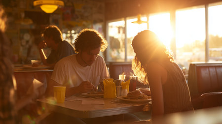 Couple shares meal at diner during sunset hours in a busy city